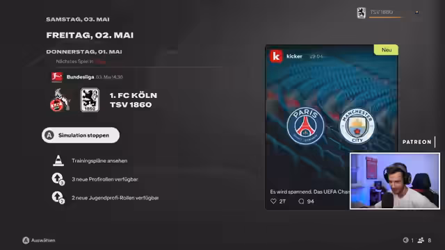 00:13:24Der Streamer begrüßt die Zuschauer zu einer neuen Folge des TSV 1860 München Karrieremodus in EAFC. Er erklärt, dass dies der letzte Livestream für dieses Projekt sein wird, da EAFC 26 kurz bevorsteht. Es wird diskutiert, ob zukünftige Projekte kürzer sein und mehr Simulationen beinhalten sollten. Das aktuelle Projekt soll jedoch ehrenvoll verabschiedet werden. Der Stream wird bis maximal 21 Uhr laufen, wobei das Ziel ist, die Saison bis zum Ende zu spielen, maximal bis zum Champions League Finale. Zusätzlich wird auf ein neues FM-Video auf dem zugehörigen YouTube-Kanal hingewiesen und die Zuschauer werden ermutigt, dieses anzusehen. Es wird erwähnt, dass Folge 238 des Karrieremodus bereits hochgeladen wurde und dies die letzte Folge mit den Löwen sein wird. Der Chat wird nach Meinungen und Vorschlägen für zukünftige Projekte gefragt, insbesondere im Hinblick auf die Balance zwischen selbst spielen und simulieren.