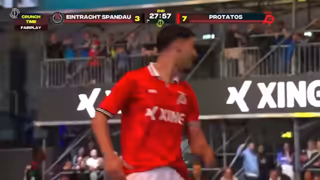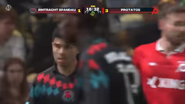 00:09:51Eintracht Spandau trifft auf die sieglosen Protatos. Spandau agiert zu kompliziert und verschwendet Chancen, während die Protatos defensiv stabil agieren und durch Gaspar Fehlinger in Führung gehen. Kurz nach dem Ausgleich durch Spandau sorgt der erste Game Changer, 'The Line', für Furore. Fehlingers Schuss aus der Distanst zählt doppelt, was zu einem Disput und einer Prüfung durch die Schiedsrichter führt.