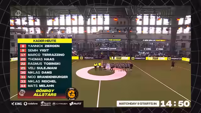 00:00:00Der LiveStream beginnt mit einem spannenden Auftaktduell zwischen Hollywood United und Gönnergy. Hollywood United, angeführt von Max Kruse, nutzt eine Ultraschallgruppierung, um früh in das Spiel zu finden. Marco Terrazzino eröffnet nach nur 28 Minuten den Torreigen. Der zweite Treffer fällt ebenfalls von Terrazzino nach einer Ecke. Hollywood United ist das dominierende Team und geht mit 2-0 in Führung, während Gönnergy nur wenige Chancen durch Niklas Reichel erarbeiten kann.