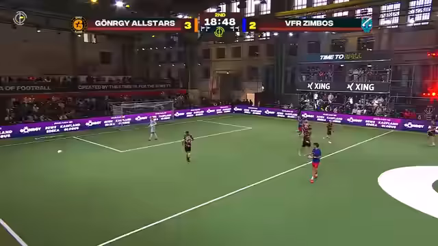 00:37:06Das Spiel Gönnergy Allstars gegen Zimbus beginnt, wobei die Zimbus als Außenseiter gelten. Gönnergy wird als großer Favorit gehandelt, insbesondere wegen ihres guten Umschaltspiels. Die Zimbus haben in dieser Saison jedoch in jedem Spiel geführt, aber die Führung nicht halten können. Sven Pistor soll für die Tore der Zimbus sorgen. Das Line-Up beider Teams wird vorgestellt, wobei Niklas Reichel als unüberwindbare Mauer im Tor von Gönnergy hervorgehoben wird. Die Referees sind Philipp Firok und Christoph Beblick. Gönnergy wird als Favorit betrachtet, da sie letzte Woche 5:0 gegen die Protatos gewonnen haben. Die Zimbus sind jedoch relativ neu zusammengewürfelt, während Gönnergy bereits im Final Four war. Gönnergy zeigt ein starkes Angriffspressing, während den Zimbus noch die Abläufe im Umschaltspiel fehlen. Meriton Saliou und Ian Prescott Claus werden als Top-Einzelspieler der Zimbus hervorgehoben. Reichel verletzt sich an der Schulter, was ein Rückschlag für Gönnergy wäre. Die Zimbus nähern sich dem Tor an, aber die letzte Reihe von Gönnergy steht gut. Ian Prescott Claus lässt sich situativ in die letzte Kette fallen. Dennis Bergmann ist Wildcard-Spieler bei Gönnergy. Die Zimbus erhalten eine Ecke, die sie gerne mitnehmen. Saliou ist ein unangenehmer Gegenspieler und muss sich an die härtere Gangart in der Baller League gewöhnen. Die Zimbus versuchen, die Breite des Feldes zu nutzen, um Gönnergy auseinanderzuziehen. Saliou agiert als Quarterback und bringt den Ball über die Außen. Die Zimbus erhalten einen Freistoß in aussichtsreicher Position. Reichel riskiert seinen Körper bei der Abwehr des Freistoßes. In der ersten Saison lief es nicht für Gunnar Jeep, aber letzte Saison war er überragend. Die Zimbus kombinieren sich fantastisch aus dem Pressing von Gönnergy heraus. Es geht in den Vodafone Game Changer mit der Spielvariante drei gegen drei. Lange kein Tor, dann fallen zwei innerhalb von einer Minute. Mit Ball wird der Torwart aufgelöst. Die Zimbus wirken sehr geordnet, vor allem gegen den Ball. Das Spiel hat ein bisschen gebraucht, ist jetzt aber komplett auf Betriebstemperatur. Es gibt administrative Probleme und Beschimpfungen, da es ums Final Four geht. Ian Prescott Claus erzielt den Ausgleich zum 2:2. Die Zimbus fordern eine Ref-Challenge, da sie glauben, dass die Shot Clock abgelaufen war. Der Treffer von Haas zum 3:2 für Gönnergy zählt mit dem Schlusspfiff der ersten Halbzeit.
