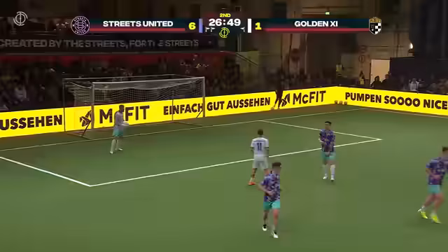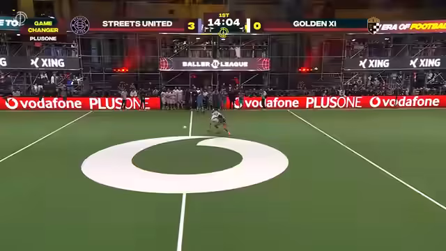 03:24:12Das Topspiel des Abends zwischen Streets United und Golden Eleven beginnt. Beide Mannschaften starten mit viel Elan in das Spiel, jedoch zeigt sich schnell, dass Streets United besser in das Spiel findet. Nach nur fünf Minuten schießt Max Düvel das 1:0 für Streets United, was die Dominanz der Mannschaft um Lukas Podolski andeutet. Das erste Tor durch Tobi Heitz wird nach einer Challenge überprüft und zählt endgültig, was die Stimmung in der Halle weiter anheizt.