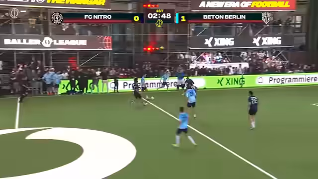 00:34:05Das Spiel zwischen Nitro und Beton Berlin beginnt, und Beton Berlin legt sofort los. Schon in der 32. Sekunde erzielt Ilyas Anan das 1:0. Die Mannschaft von Trainer Kontra K zeigt ein hohes Pressing und eine beeindruckende Organisation. Spieler wie Musti Chahur sind kaum vom Ball zu trennen. Nitro wirkt in der Anfangsphase überfordert und findet erst langsam ins Spiel. Durch den frühen Rückstand und die Personalmisere kämpft Nitro gegen eine sich immer weiter ausbauende Führung. Die Kommentatoren betonen die Klasse von Beton Berlin, während Nitro kämpferisch bleibt, aber dem Spieldruck kaum standhalten kann.