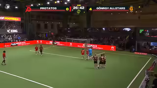 01:39:15Im zweiten Spiel zwischen den Protatos und Gönnergy herrscht anfangs ein taktisches, ruhiges Spiel. Gönnergy geht durch Pascal El-Nemmer in Führung. Das Spiel wird durch die Einführung eines Vodafone Game Changers unterbrochen, bei dem Tore vor der Abseitslinie doppelt zählen. Beide Teams agieren vorsichtig, was zu wenigen Toren führt. Es kommt zu einer kleinen Verletzungpause, als Alexander Lipinski nach einem Zweikampf auf dem Boden liegt, aber weitermachen kann.