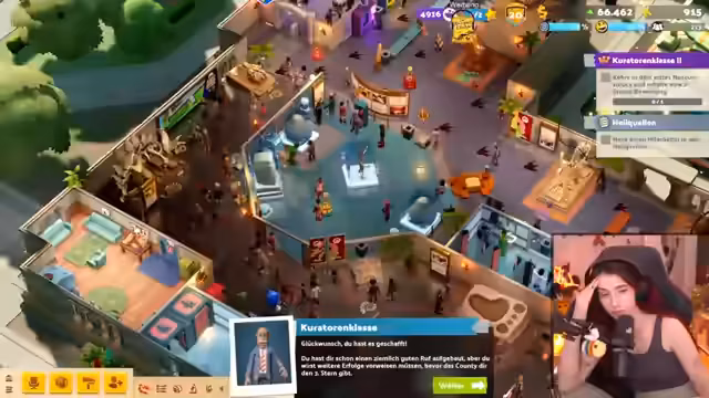 03:07:08Im Fokus des Spielgeschehens stehen die Ziele der Kampagne, konkret die Erzielung einer Zwei-Sterne-Bewertung für das Museum. Dazu muss der Streamer unter anderem ein Botanik-Exponat von epischer Qualität finden und einen kranken Mitarbeiter zu den Heilquellen schicken. Er reflektiert das komplexe Mitarbeiter-Managing, die Weiterbildungsmöglichkeiten und die Herausforderungen, bestimmte Voraussetzungen im Spiel zu verstehen.