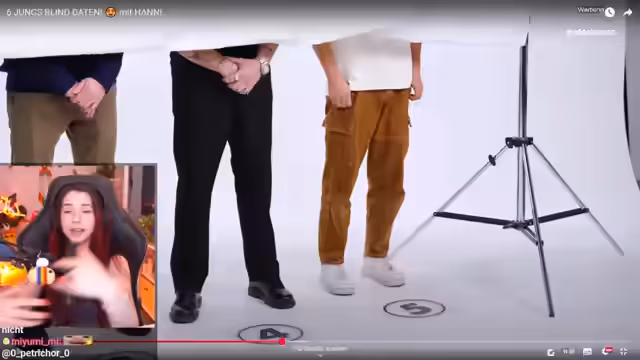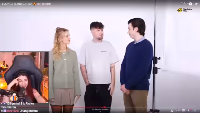 01:52:02Während des Datings entsteht eine lockere und zugleich spannungsgeladene Atmosphäre. Die Kandidaten nehmen körperliche Nähe zueinander, indem sie sich die Hände halten und die Kandidatin sich die Hände der Männer ansieht. Besonders der Kandidat Nummer four macht durch sein selbstbewusstes Auftreten Eindruck. Der Streamer kommentiert die Tension und findet es positiv, dass die Männer die Chance auf eine direkte Nähe nutzen und es nicht bei oberflächlichen Bemerkungen belassen.