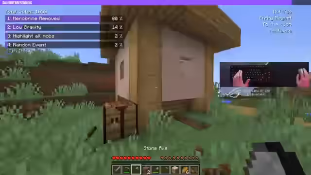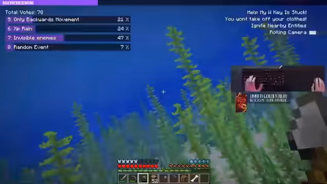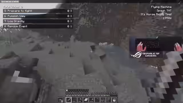 00:38:25Die Spieler suchen nach einem Dorf, um Betten zu finden und zu schlafen. Währenddessen bemerken sie das Event "Chicken Rain", das sie als entspannt einstufen. Kurz darauf folgt "Arrow Rain", was sie zwingt, sich einzubauen, um Schutz zu suchen. Der Chat wählt daraufhin "Vertical Screen", um sie aus ihrem Versteck zu locken. Anschließend spawnen Wardens, vor denen sie fliehen müssen. Kevin stirbt, woraufhin der Chat "Teleport All Nerve Nearby Entities to Player" wählt, was zu einem unerwarteten und schwierigen Moment führt. Basti und Kevin beschließen, ein Bett zu craften und die Nacht zu überstehen. Es folgt der Effekt "Maus drifting", der die Steuerung erschwert. Sie finden einen Lavasee und planen, ein Portal zu bauen, suchen aber zuerst nach einem Dorf in der Wüste. Das Event "Was du anguckst, geht instant kaputt" erweist sich als nützlich zum Abbauen von Bäumen.
