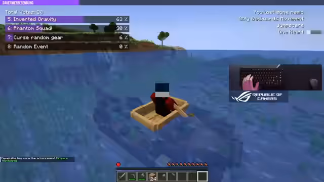 00:28:10Kevin erklärt das Ziel der Challenge: den Enderdrachen zu besiegen, wofür sie acht Bladeshots und zwölf Enderperlen benötigen. Es folgen neue Herausforderungen wie Horse Riding Time und Spawn-Killer-Bunny, die das Vorankommen erschweren. Sie suchen nach einem Shipwreck, um Essen zu finden, und erhalten verzauberte Ausrüstung. Der DVD-Screensaver als Effekt sorgt für zusätzliche Ablenkung. Sie testen, ob der DVD-Screensaver auch im Boot aktiv ist. Es folgen weitere Effekte wie Easy und So Sweet, deren Auswirkungen unklar bleiben. Nach dem Fund eines Rune Portals verlieren sie ihr Boot und bauen es neu. Sie diskutieren über die Machbarkeit der Challenge und erhalten den Effekt "Zukunft", der gewöhnungsbedürftig ist. Es folgen weitere Herausforderungen wie das Heuspult und Angriffe von Pickmans, die sie abtauchen lässt.