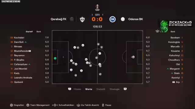 02:16:28Das erste Euroleague-Qualifikationsspiel gegen Karabag steht an. Die Taktikansicht wird gezeigt und die Aufstellung des Gegners analysiert. Karabag spielt defensiv mit einer Sechserkette. Die Fans sind lautstark. Karabag setzt auf ein offensives 4-5-1. Das Ziel ist es, zu zeigen, dass man Euroleague-ready ist und sich von der Conference League in die Champions League steigern will. In der simulierten Ansicht wachsen die Gegner oft über sich hinaus. Fiete erzielt die erste Ecke. In der Halbzeit steht es 1:0 für das eigene Team. In der zweiten Halbzeit wird die Formation des Gegners analysiert. Es wird überlegt, Rocco Shine einzuwechseln. Am Ende gewinnt das Team mit 1:0.