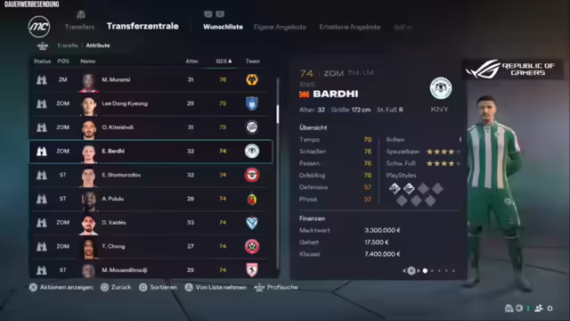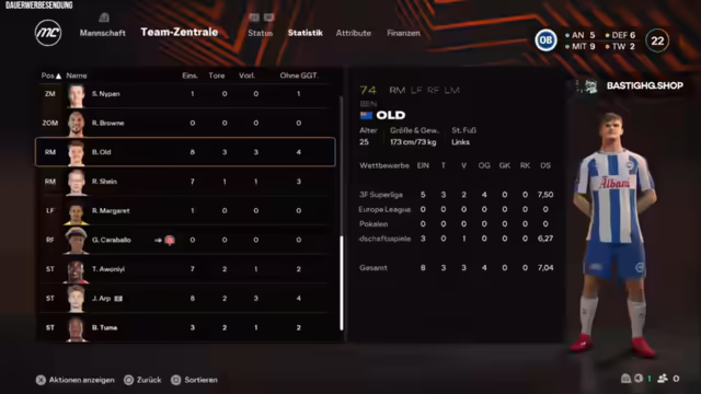 03:07:04Das Team qualifiziert sich trotz aller Widrigkeiten und Schikanen in Aserbaidschan für die Euroleague, was als historischer Erfolg gefeiert wird. Nach dem Spiel werden finanzielle Mittel durch den Verkauf von Bates frei, die für die Verstärkung des Kaders genutzt werden sollen. Der Fokus liegt auf der Verpflichtung von ablösefreien Spielern, um die Mannschaft zu verstärken. Es wird überlegt, Valentin Antov als Ersatz für David Bates zu verpflichten. Es wird versucht, eine Leihe für den Flügel zu realisieren, eventuell mit Enes Bardi oder einem Spieler aus El Salvador. Charles Mambo aus Mauretanien wird als vielversprechende Option für eine Leihe in Betracht gezogen. McCaw's Land Rückleihe wäre eine geile Storyline. Man einigt sich auf eine Leihe ohne Kaufoption für einen Stürmer aus Mauretanien. Es wird überlegt, die Taktik zu ändern und offensiver zu spielen, da die Mannschaft konditionell nicht für ein ganzes Spiel gerüstet ist. Rocco Schein wird auf der 10er Position eingesetzt und Aboni wird für den Keeper ausgewechselt.