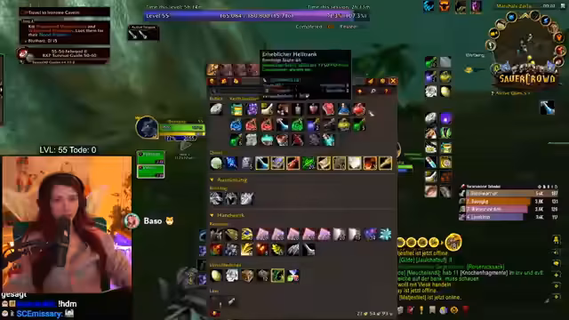 05:48:31Kurzzeitig wird eine Pause für einen Imbiss eingelegt, während die Gruppe weiterhin mit dem Dungeon fortfährt. Es entsteht eine Diskussion über das volle Inventar, da der Streamer Platzmangel für gesammelte Items wie Mojo und Trollschweiß hat. Das Gespräch dreht sich um die Inventarverwaltung und die Frage, welche Items behalten werden sollen. Die Gruppenmitglieder koordinieren sich, um Platz zu schaffen und Loot fair zu verteilen.