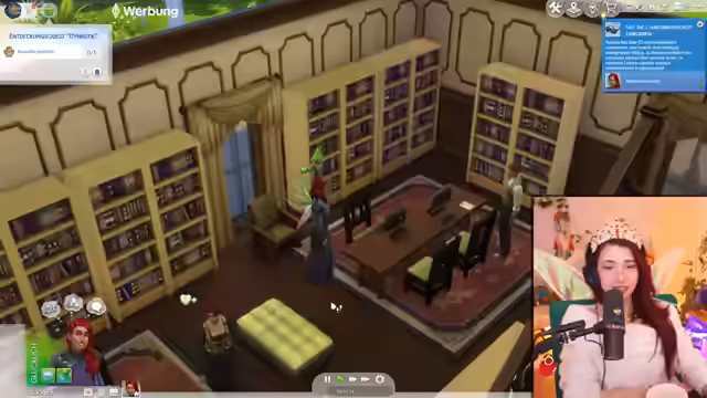 02:13:37Die Begegnung mit der Botschafterin in der Bibliothek wird intensiviert. Der Streamer stellt sich vor und möchte wissen, ob ein Adelstitel frei ist. Der Gesprächsverlauf wird jedoch durch die soziale Beschaffenheit der Sims unterbrochen, da die Botschafterin permanent mit anderen Sims interagiert. Das Erstellen der eigenen Dynastie, die Katz-Dynastie, wird gestartet. Das Oberhaupt der Dynastie kann Werte, Fähigkeiten und Ideale bestimmen und Dynastievorteile kaufen.