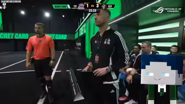 05:34:16Das eigene Team befindet sich in der Verlegenheit, ein Spiel nicht verlieren zu dürfen, und kann den richtigen Moment zum Konter nicht finden. Gegner G2 hat eine sogenannte 'Secret Card' aktiviert, deren Strategie noch unklar ist. Über die Möglichkeit eines Elfmeters oder eines Shootouts wird spekuliert, während das eigene Team diskutiert, welchen Spieler man auswechseln soll, um defensiv stärker zu werden oder einen Torschuss zu wagen.