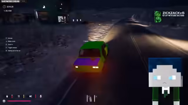 01:06:23Nachdem die extensive Vorbereitung abgeschlossen ist und das Auto vollständig mit Sprit und Vorräten beladen ist, steht der Start der gemeinsamen Fahrt an. Da Kevin der erfahrenere Spieler ist, übernimmt er die Fahrertätigkeit. Der Streamer dreh sich noch einmal um und fragt, ob die Ladung sicher verstaut ist, um die Reise in die ungewisse Spielwelt anzutreten.