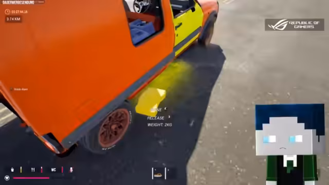 00:38:52Es wird ein gemeinsames Spiel gespielt, bei dem es darum geht, mit einem auffälligen Auto so weit wie möglich zu fahren. Dafür müssen Sprit und Upgrades gefunden werden, eventuell auch ein anderes Auto. Es werden bereits Downgrades am Auto vorgenommen und die Garage wird erkundet. Es werden Raketenwerfer gefunden. Es wird erklärt, dass es im Spiel darum geht, so weit wie möglich zu fahren und unterwegs Sprit, Upgrades und eventuell ein neues Auto zu finden. Es wird überlegt, ob es im Spiel auch Monster wie im letzten Game geben wird. Es werden Reifen, ein Lenkrad und Sprit gefunden und montiert. Der Streamer uriniert in die Garage. Es wird ein V8-Motor eingebaut, der gut klingt. Es wird festgestellt, dass das Auto einen halben Tank Sprit hat. Es wird ein Tacho ausgebaut und eine Kofferraumklappe montiert. Es werden Getränke und ein Katzenbild in den Kofferraum gepackt. Der Streamer spielt Gitarre im Spiel und singt dazu. Es wird überlegt, ob der Rucksack mitgenommen werden soll und was alles hinein muss, wie z.B. ein Erste-Hilfe-Set, eine Warnweste und ein Warndreieck. Es wird ein Stoßdämpfer gefunden und ein Rammbock montiert. Es wird entschieden, ohne Gewalt zu spielen. Rostentferner und ein Schwamm werden eingepackt. Es wird festgestellt, dass der Motor immer wieder anspringt. Es wird überlegt, ob die Gitarre mitgenommen werden soll. Es wird so viel Essen und Trinken wie möglich eingepackt, sowie Benzin. Der Kühlschrank wird leer geräumt.