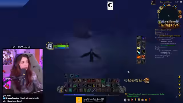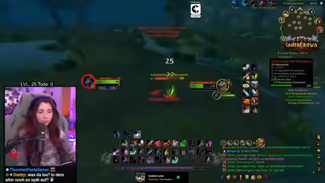02:07:48Nachdem die Pilze gesammelt sind, muss der Streamer dringend Erdwurzeln für die Droiden-Quest finden. Er ist sich nicht sicher, wo er sie finden kann, da er die Aufgabe vergessen hatte. Parallel dazu macht er sich Gedanken über den Spieler Toonie, der in League of Legends verschwunden ist und vermisst die gemeinsamen Quests in WoW. Das Thema des Spielerverlusts durch den Tod auf hohem Level wird kurz aufgegriffen, als der Streamer von einem Spieler namens Asta erfährt, der bei Level 33 in 1000 Nadeln gestorben ist und wahrscheinlich neu anfängt.