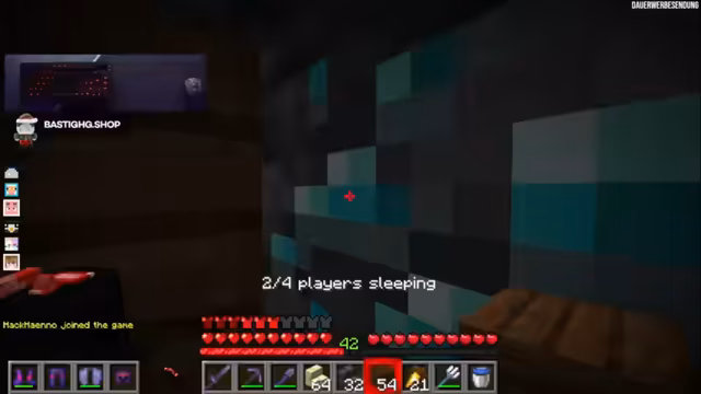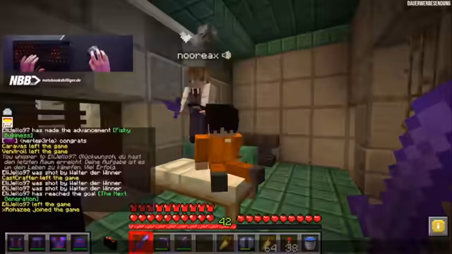 08:30:55Der Streamer verabschiedet sich für die Nachtschicht, die er als 'beste Erfindung aller Zeiten' bezeichnet. Er und ein weiterer Spieler, Norax, haben noch einiges zu tun, um den Raum für das Jump'n'Run zu gestalten. Sie planen, den Raum im Endstone-Stil mit pinken und lilanen Akzenten zu gestalten und die ersten Sprünge zu planen. Sie wollen das Loch schließen und sicherstellen, dass das Jump'n'Run optisch ansprechend wird. Es wird betont, wie wichtig es ist, den Bereich auszuleuchten, um Creeper zu vermeiden. Die Idee ist, das Jump'n'Run auf der aktuellen Höhe zu beginnen und den Raum als Miniatur-End mit Obsidian-Türmen zu gestalten. Es wird auch über die Möglichkeit gesprochen, eine schwebende Endinsel im Wald zu bauen, was jedoch schwierig zu verteidigen wäre. Die Sicherheit der Basis wird besprochen, und Veto wird gebeten, die Basis zu überwachen, falls sich jemand einloggt.