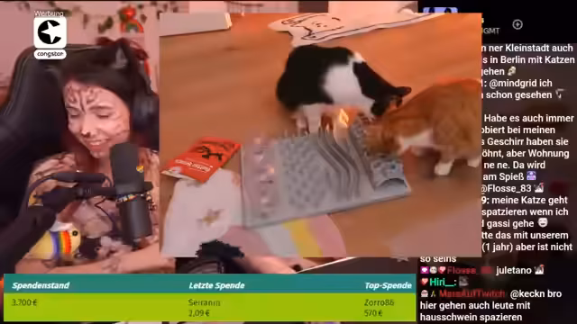 03:01:35Um die gesammelten Spenden symbolisch zu feiern und den Fokus auf die Katzen zu legen, wird eine Beschäftigungssession mit den eigenen Katzen Luna und Ferox im Stream organisiert. Es wird ein Fummelbrett mit Snacks aufgestellt, wobei die Streamer-Kamera den Katzen beim Herausfummeln der Leckerlis zuschaut. Die süßen Momente werden mit der Kamera eingefangen und kommentiert. Der Streamer nutzt die Gelegenheit, um über die Haltung von Katzen zu sprechen, wie z.B. das Spazierengehen und die Anschaffung einer zweiten Katze, und gibt Ratschläge an die Community.