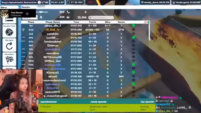 03:46:29Während der Murmelrunden interagiert der Streamer intensiv mit dem Chat, kommentiert das Spielgeschehen und reagiert auf die Leistungen der Teilnehmer. Es werden viele verschiedene Maps gespielt, die teilweise als unfair oder chaotisch beschrieben werden. Besondere Momente sind ein knapper Sieg von JD und ein kreativer Nickname. Der Streamer spendiert den Gewinnern Abo-Geschenke oder den VIP-Status und kommentiert humorvoll die spielerischen Leistungen und die chaotischen Abläufe auf den verschiedenen Murmelbahnen.