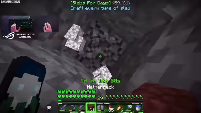03:07:59Ein Meilenstein des Streams war die Fertigstellung eines Raumes, der alle 61 Slabs ausstellt, die es im Spiel gibt. Dies dient dem Streamer als eine Art Erinnerungsstück und Abschluss dieser Sammlung. Als nächstes Großprojekt wurde die Beschaffung aller Goldhörner angekündigt. Hierfür wird eine spezielle Zuchtanlage für Ziegen gebaut, um die seltene Screaming Goat zu züchten, da deren Hörner eine wichtige Voraussetzung für das Achievement sind.