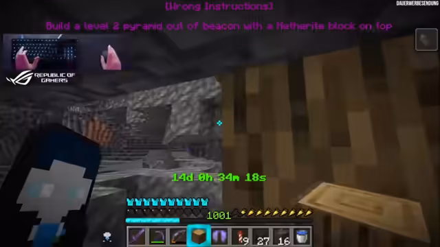 01:04:04Nachdem alle 34 Beaçons hergestellt wurden, beginnt der Streamer mit dem Bau einer Level-2-Pyramide. Das große, optisch ansprechende Projekt ist ein wichtiger Meilenstein. Anschließend wird das nächste Achievement aktiviert, das das Halten von 100 Schlägen mit einem Mace in der Luft erfordert. Das Ziel wird zunächst erreicht, aber die Registrierung des Achievements fehlschlägt.