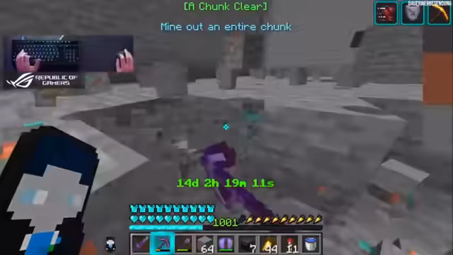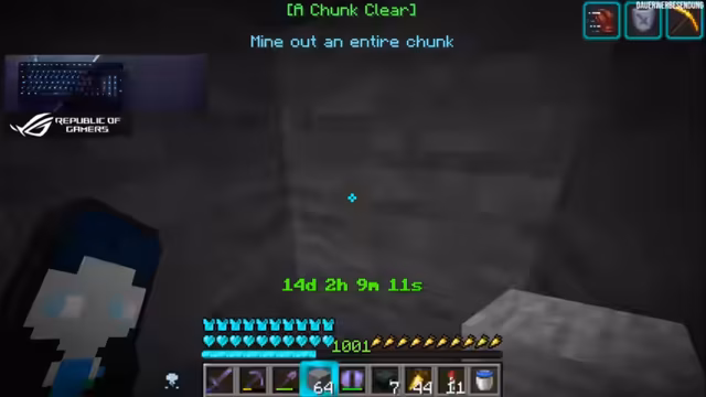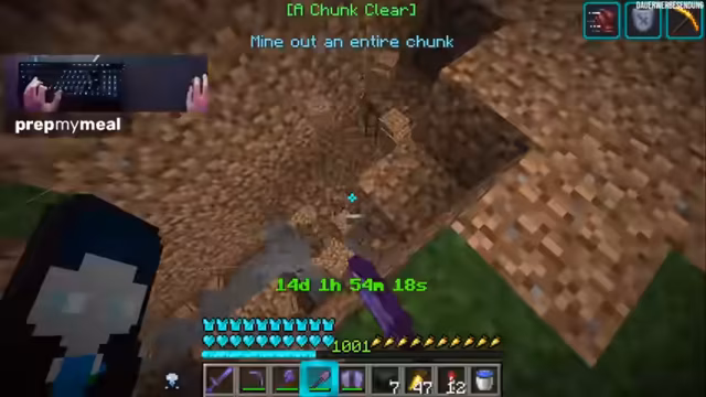 01:57:19Nachdem das Mace-Achievement erfolgreich per Kommentar freigeschaltet wurde, wird das nächste in Angriff genommen: Ein kompletter Chunk muss abgebaut werden. Der Streamer nutzt sein volles Equipment mit Effekten wie Haste 2, um diese Aufgabe zügig zu bewältigen. Die Stelle für das Loch wird strategisch gewählt, um einen optisch ansprechenden und nützlichen Bereich zu schaffen.