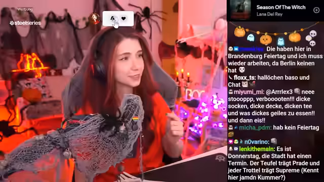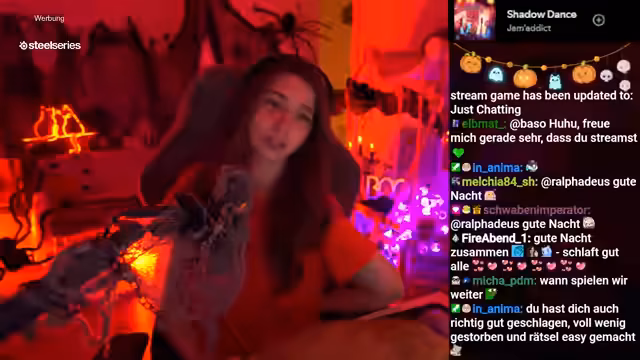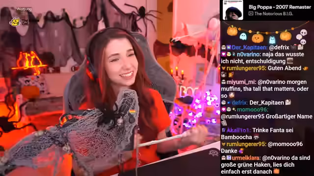00:10:19Der Stream beginnt mit einer kleinen Verwirrung über die Musik im Hintergrund. Streamerin begrüßt die Zuschauer herzlich zum dritten Halloween-Stream und erklärt, dass sie die Deko erst kurz vor dem Stream realisiert hat. Sie zeigt die Halloween-Deko, einschließlich einer Spinnen- und Fledermaus-Deko und erwähnt, dass die Skeletthand ihr zukünftig als Emotional Support dienen wird. Sie beschreibt auch ihren zeitlichen Stress, da sie die Deko erst kurz vor dem Stream aufgestellt hat, nachdem sie vorher keine Zeit dazu gefunden hatte.