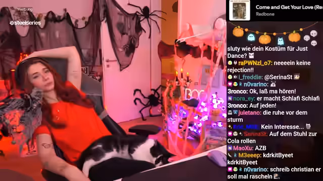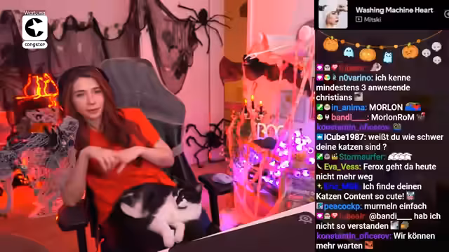 01:15:35Die geplante Stream-Aktivität wird durch das unerwartete Verhalten der Katze Ferox unterbrochen. Dieser hat in den letzten Halloween-Streams regelmäßig den Streamer belegt und tut es auch heute wieder. Ferox, der bis vor kurzem nie auf den Schoß kroch, ist seit ein bis zwei Wochen der geborene Kuschelkater. Das Verhalten stellt einen signifikanten Planwechsel dar, da der Stream fast gänzlich zum Ferox-Stream wird.