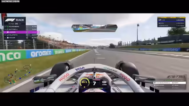 00:49:32Im Verlauf des Streames werden Rennen in verschiedenen Städten wie Monza, Barcelona und Miami absolviert. Der Streamer hat mit Problemen wie kollisionsbedingten Schäden am Fahrzeug, insbesondere am Frontflügel, zu kämpfen, was seine Kontrolle stark beeinträchtigt. Er muss Boxenstopps einlegen und sucht dabei nach der richtigen Taste. Seine Strategien sind manchmal unzureichend, was zu ungenügendem Tempo und Positionverlusten führt. Die Konzentration leidet, da er häufig im Chat liest und sich gleichzeitig auf das anspruchsvolle Fokusieren konzentrieren muss.