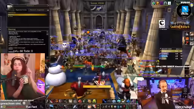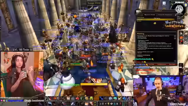 02:35:09Das Gilden-Meeting findet in der Kathedrale des Lichts statt. Der Streamer bezeichnet dies als das letzte große Meeting des Sauerkraut-Projekts, nach fast zwei Monaten, was er als crazy und gleichzeitig schnell vergehend empfindet. Er zeigt große Wertschätzung für das Projekt und die anwesenden Leute. Die Hauptpunkte der Agenda sind die Vorstellung der Mitarbeiter der Woche, der Clip der Woche sowie die Bekanntgabe der finalen Teilnehmerliste für den anstehenden Molten-Core-Raid.