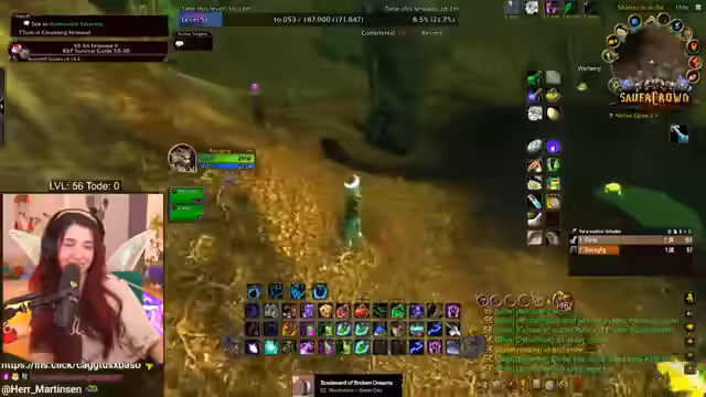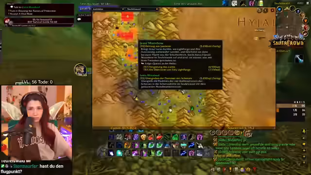 04:27:15Zurück im Spiel macht sich die Streamerin auf den Weg in den Teufelswald, um dort Quests abzuschließen und weiterzuleveln. Sie beschreibt ihre Freude an dieser Aktivität, die die meiste ihrer Spielzeit ausmacht, und sammelt Kräuter, die sie für eine Quest abgeben kann. Dabei interagiert sie ständig mit dem Chat, der ihr bei der Navigation und der Aufklärung von Questdetails hilft. Sie zeigt sich verwirrt über das Spiel, als sie anstatt einer erwarteten Pflanze etwas anderes lootet, und bittet den Chat um Aufklärung.