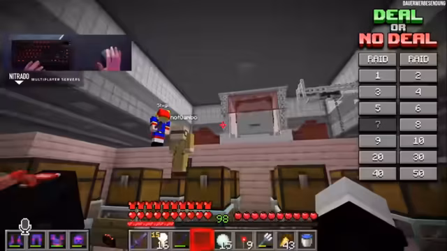 06:32:49Basti wird zu einem Spiel "Deal or No Deal" eingeladen, bei dem 16 Kisten mit unterschiedlichen Preisen gefüllt sind, darunter bis zu 50 Subs. Es gibt auch Nieten, die bedeuten, dass man 100 Subs geben oder den Gastgeber raiden muss. Basti wählt Kiste 13 als seinen Koffer. Der Banker bietet frühzeitig 2 Subs an, was Basti ablehnt. In der ersten Runde werden die Kisten 1, 2, 3, 4 und 14 geöffnet, wodurch 7, 10, 9, 6 und 3 Subs entfernt werden. Der Banker bietet daraufhin 15 Subs an, was Basti ebenfalls ablehnt. In der nächsten Runde werden die Niete (Raid) und die Kiste mit 30 Subs geöffnet, wobei Basti 5 Subs für das Erraten der 30 Subs gewinnt. Die Kiste mit 40 Subs wird ebenfalls geöffnet. Der Banker bietet 12 Subs an, was Basti erneut ablehnt. Nach weiteren geöffneten Kisten (4, 1, 20) bietet der Banker 16 Subs an, was Basti wieder ablehnt. Die Kisten 8 und 5 werden geöffnet. Das Angebot des Bankers steigt auf 17 Subs. Basti lehnt ab und öffnet die Kiste 7, in der sich die 50 Subs befinden. Der Banker bietet 25 Subs plus 5 Subs von Stegi an, was Basti annimmt. Am Ende wird enthüllt, dass in Bastis ursprünglich gewähltem Koffer (Kiste 13) die Niete (Raid) war, was die Entscheidung für den Deal als richtig bestätigt.