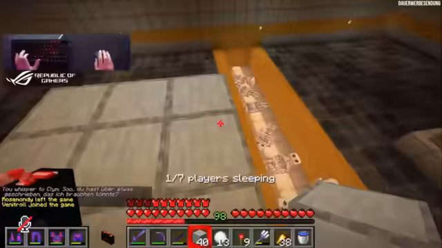 09:17:08Ein Problem wird bekannt: Jemand hat die Amadillo-Farm zerstört, alle Amadillos angezündet und getötet, wodurch keine Level mehr gefarmt werden können. Dies erfordert die Zucht neuer Amadillos. Inmitten dieser Ereignisse wird ein neues Bauprojekt für Veto in einem 5x5-Raum in der Erde besprochen, wobei der Streamer aufgefordert wird, mit Light Blue Glazed Terracotta und Diablöcken zu bauen. Gleichzeitig wird ein Prank an Heikos Boot geplant, bei dem das Boot entoxidiert und mit Honig-Shit und Bienenlachs präpariert wird, um den Prank über mehrere Tage langsam entstehen zu lassen. Die Diskussion über die genaue Formulierung des Pranks und die Schwierigkeit, Nachrichten im Chat zu übermitteln, zeigt die Dynamik und den Humor innerhalb der Community. Die Planung weiterer Räume und die Beendigung des Laborprojekts, um sich auf das Kanalisationsprojekt zu konzentrieren, stehen ebenfalls im Vordergrund.
