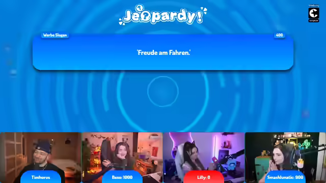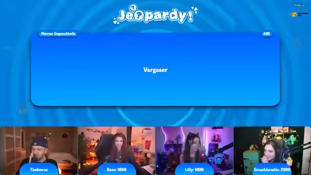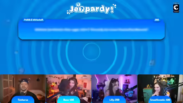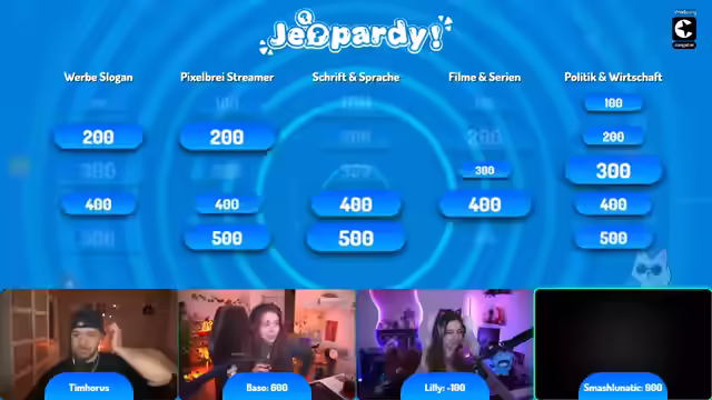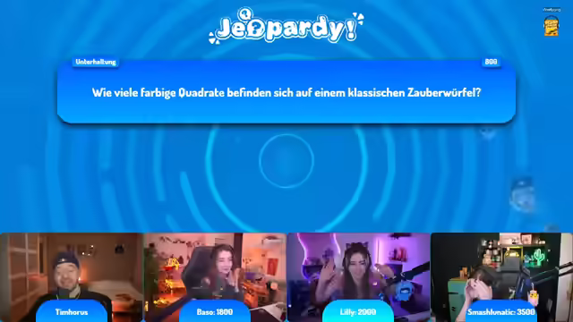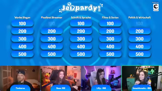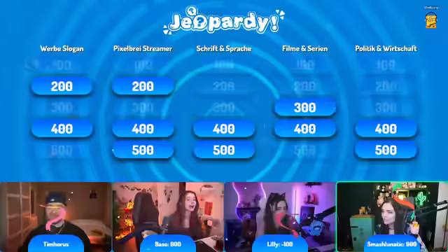 01:15:35Es wird über das Befinden der Teilnehmer gesprochen und sich nach einem Stromausfall bei Swalu erkundigt. Halloween-Kostümpläne werden diskutiert, wobei die Idee eines Cosplays als Tim Horus aufkommt. Die Frage, ob ein ungruseliges Kostüm langweilig sei, wird aufgeworfen. Es wird gescherzt, als sexy Katze zu gehen, wobei die Idee einer 3-Meter-Katze entsteht, die aus Ober- und Unterbau besteht. Die Aufregung vor der Show wird thematisiert, insbesondere da die Show ohne Regie stattfindet. Es folgt eine Anmoderation für YouTube, in der die Teilnehmer vorgestellt und der Ablauf der Jeopardy-Show erklärt wird: zwei Boards mit unterschiedlichen Punktwerten und eine Finalfrage, bei der Punkte gesetzt werden können. Die Zuschauer werden aufgefordert, die Kanäle der Mitspieler zu abonnieren und auszuchecken. Das erste Board mit den Kategorien wird gezeigt, darunter Werbeslogan, Pixelbrei Streamer, Schrift und Sprache, Film und Serien sowie Politik und Wirtschaft.