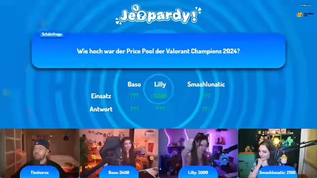03:11:56Die finale Runde von Jeopardy stand an, bei der es um eine Schätzfrage ging: Wie hoch war der Prize Pool der Valorant Champions 2024 in US-Dollar? Die Kandidaten setzten ihre Punkte ein, wobei Lilly 1500, Smash Lunatic 2000 und Linda sogar 3400 Punkte riskierten. Die Schätzungen gingen weit auseinander: Linda tippte auf 100.000 Dollar, Lilly auf 6 Millionen und Smash Lunatic auf 690.000 Dollar. Die richtige Antwort lag bei 2,25 Millionen US-Dollar. Smash Lunatic lag mit ihrer Schätzung am nächsten dran und gewann somit die Jeopardy-Folge. Trotz des Wettbewerbs betonten alle Teilnehmer, dass der Spaß im Vordergrund stand und es ein gelungener Abend war. Es wurde sich für die Einladung bedankt und die gute Moderation gelobt. Außerdem wurde über zukünftige Rematches und Themen für weitere Quizze gesprochen, wie zum Beispiel ein Anime-Quiz mit Inuyasha-Kategorie.