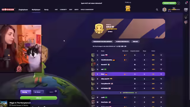 04:18:39Die Streamerin erwähnt einen Pullover von Only für 29 Euro und zeigt einen 'Megaloot', ein verlorenes Schnurrhaar ihrer Katze Luni, das sie auf dem Boden gefunden hat. Sie fragt andere Katzenbesitzer, ob sie auch Katzenschnurrhaare sammeln und präsentiert stolz ihre Sammlung in einem Shotglass, das sie seit etwa zwei Jahren aufbewahrt. Sie scherzt darüber, was sie in Zukunft damit machen könnte, vielleicht sogar eine dritte oder vierte Katze daraus bauen. Danach lenkt sie das Gespräch auf die Vorbereitung für ein GeoGuessr-Turnier am Freitag. Sie erklärt, dass sie gestern zum ersten Mal im Rang Gold 3 gespielt hat und es viel schwieriger ist als in Silber. Sie beschreibt, dass man in Gold 3 oft auf abgelegenen Feldwegen ohne erkennbare Sprache ausgesetzt wird. Trotzdem will sie weiterhin in Gold 3 üben und ermutigt den Chat, mitzuraten und nach den Runden konstruktive Kritik und Tipps zu geben. Sie betont, dass sie während der Runden nicht in den Chat schaut, um sich nicht ablenken zu lassen.