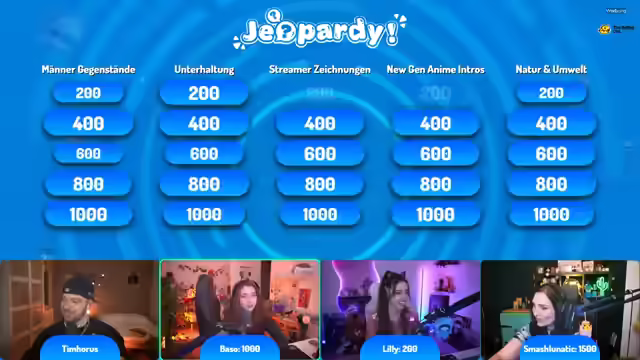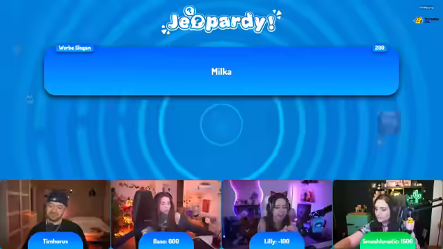 02:55:48In der aktuellen Jeopardy-Runde gab es einige amüsante und verwirrende Momente. Zunächst wurde eine Streamer-Zeichnung interpretiert, die sich als Darstellung eines Heiratsantrags herausstellte. Anschließend ging es um Männergegenstände, wobei ein Multimeter gesucht wurde, das zunächst fälschlicherweise als Fleischtemperaturmesser identifiziert wurde. Besonders kurios wurde es bei der Kategorie 'Unterhaltung', als es um die Farbe einer Rosette auf Pedigree-Hundefutter ging. Hier herrschte große Ratlosigkeit, da niemand wusste, was mit Rosette gemeint war. Es gab sogar einige zweideutige Assoziationen, bevor die korrekte Definition als dekoratives Element in Form einer Rosenblüte geklärt wurde. Die korrekte Antwort auf die Frage nach der dominierenden Farbe war Rot, was für weitere Verwirrung sorgte, da viele an das gelbe Logo dachten. Im weiteren Verlauf wurden Anime-Intros erraten und Streamerzeichnungen interpretiert, wobei es um Papa Platte und Seegras ging. Bei der Kategorie 'Natur und Umwelt' ging es um Apfelsorten und bei 'Männergegenstände' um einen Inbusschlüssel, bei dem es zu einer lustigen Verwechslung mit 'Nimbus' kam.