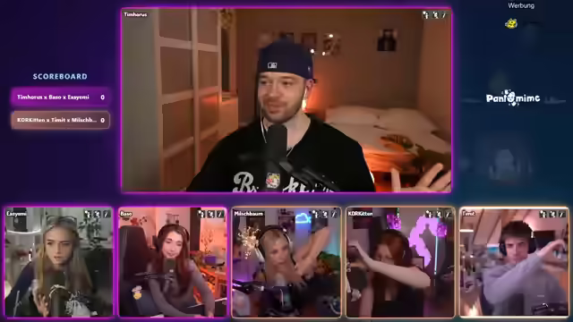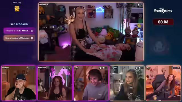 03:12:52Eine neue Erklärungsrunde beginnt, in der Begriffe wie 'Pyjama', 'Sekundenkleber', 'Bonsai' und 'Anzug' erklärt werden müssen. Es kommt zu einer Diskussion über die Gültigkeit des Wortes 'Anzug', da Timmit Pantomime-Gesten verwendet hat. Es wird eine Verwarnung ausgesprochen und der Punkt aberkannt. Es folgt eine Runde 'Schere, Stein, Papier', um den Punkt neu zu vergeben. Linda übernimmt eine Zeichenrunde und stellt 'Mehrfachsteckdose', 'Löwenzahn', 'Gurkenwasser' und 'Telefonkabelkupplung' dar. Am Ende werden die Platzierungen der Teams bekannt gegeben. Baso, Easy Emi und Milchbaum gewinnen diese Runde. Es folgt eine Diskussion über komische Chatnachrichten und einen Dance-Move. Es wird vorgeschlagen, eine finale Runde zu spielen, in der jeder mit jedem spielt.