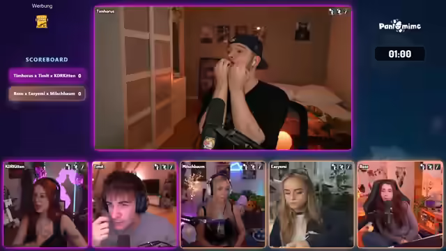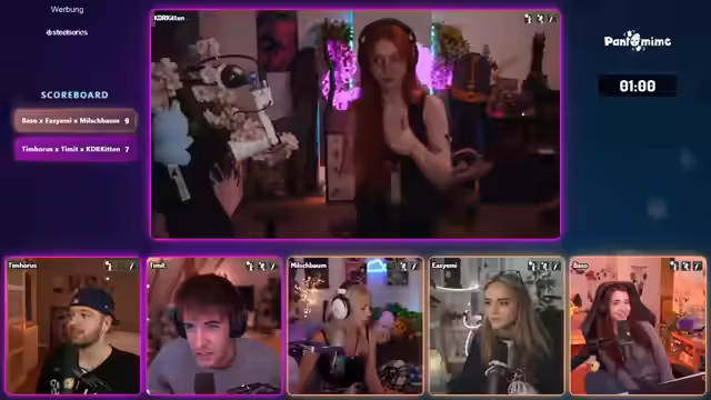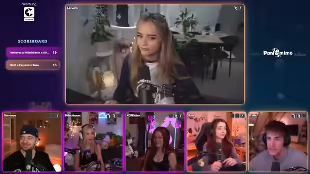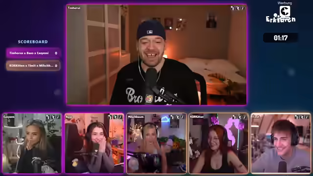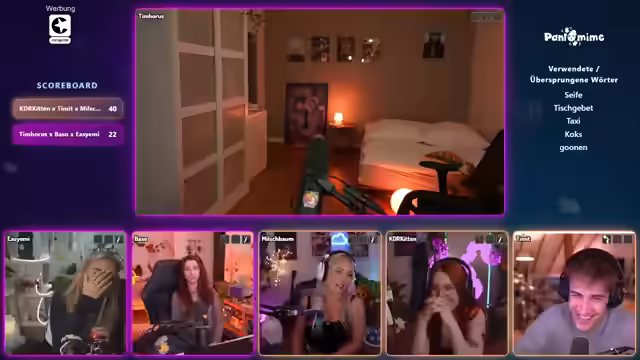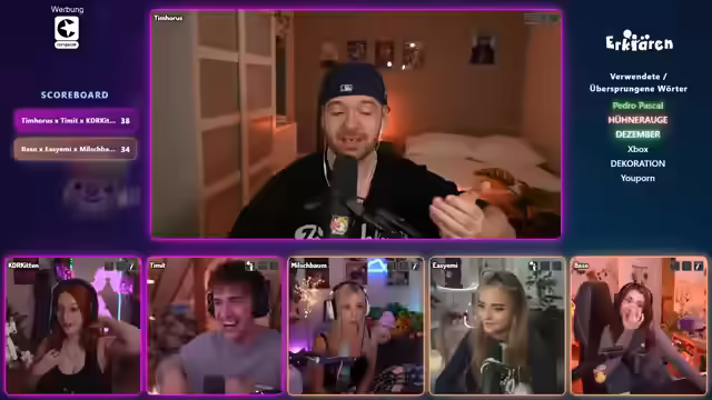 02:28:58Eine neue Spielrunde beginnt mit veränderten Teams: Tim Horus, Tibbet und Kader Kitten treten gegen Baso, Easy Emi und Milchbaum an. Es ist ein Geschlechterkampf – Männer gegen Frauen. Die Kategorien werden zurückgesetzt, und die erste Kategorie ist 'Albtraum', was zu Begriffen wie 'Bäcker', 'Uhrzeit' und 'Verschlafen' führt. Weitere Begriffe in der Runde sind 'Schlafenszeit', 'Leiter', 'Affe', 'Bouldern' und 'Feuerwehrmann'. Es folgen Assoziationen zu 'Schwimmen' und 'Schießen', wobei einige Begriffe als schwierig oder zu einfach eingestuft werden. Die Runde endet mit einer Diskussion über die Schwierigkeit einiger Begriffe und einem direkten Skript.