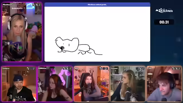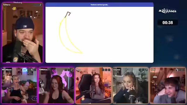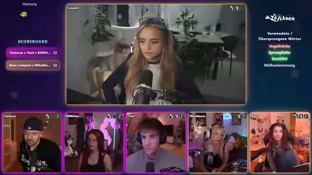 02:37:14Eine Zeichenrunde beginnt, in der Emi die Brille aufsetzt, was die Ernsthaftigkeit unterstreicht. Technische Probleme mit der Browser-Beschleunigung werden thematisiert. Gezeichnet werden 'Felsen', 'Stein', 'Treppe', 'Spule' und 'Sprungfeder'. Es wird festgestellt, dass Kreise nur langsam geladen werden. Weitere Begriffe sind 'Kartoffeln', 'Ei', 'Eierbecher', 'Eierlöffel', 'Tomate', 'Apfel', 'Granatapfel', 'Ananas' und 'Schere'. Das Wort 'Müllverbrennung' wird als schwierig eingestuft. Die technischen Schwierigkeiten beeinflussen die Zeichenqualität. Am Ende werden die erreichten Punkte gezählt und die Schwierigkeit einiger Begriffe diskutiert. Timmit übernimmt die nächste Zeichenrunde, mit dem Ziel, viele Punkte zu holen.