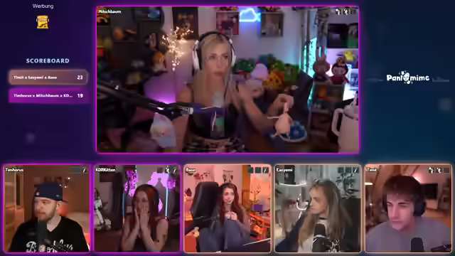 02:40:52Die nächste Runde startet mit Pantomime, in der Timmit 'Sixpack', 'Geschenkpapier' und 'Geschenkanhänger' darstellt. Es folgen weitere Runden mit Begriffen wie 'Zocken', 'Mülltrennung', 'Schal anziehen' und 'Mund-zu-Mund-Beatmung'. Es wird diskutiert, wie schwierig es war, das Wort 'Zocken' darzustellen. Linda übernimmt die nächste Runde mit Erklärungen und beschreibt Begriffe wie 'Glühwürmchen', 'Halbkreis', 'Regenmantel' und 'Krabbe'. Es folgt eine Pantomime-Runde mit Milchbaum, in der Begriffe wie 'Foltern' dargestellt werden, was zu Diskussionen über die Wortwahl führt. Es folgen weitere Erklärungsrunden, in denen Begriffe wie 'Teppich', 'Wer wird Millionär?', 'Exorzismus', 'Vegetarier' und 'CSI New York' erraten werden müssen. Emi übernimmt die Pantomime-Runde und stellt 'Rauchen', 'Tennisarm', 'Wartezimmer' und 'Schneidersitz' dar.