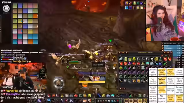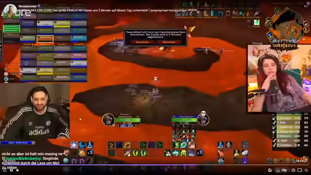 02:08:54Das Team zieht weiter und bereitet sich auf den nächsten Boss vor. Die Organisation bleibt komplex; es müssen World Buffs eingesammelt und ein makelloses Pullen koordiniert werden. Währenddessen findet parallel eine Loot-Vergabe statt. Der Streamer bemerkt, wie einige Zuschauer 20 Minuten auf das Ende der Vorbereitung warten, um dem Raid beizutreten, was er als 'süß' und typisch für den Streamer 'Hanno' beschreibt. Es wird ein grober Feuerschutztrank für alle empfohlen, da der nächste Boss Feuerflächen verursacht.