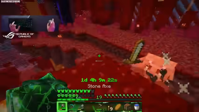 00:56:04Nach langer Vorbereitung wird das Nether-Portal platziert und betreten. Der Streamer äußert seine Aufregung und Hoffnung, eine Festung zu finden, um an Netherwarzen und Lohenruten für Tränke zu gelangen. Nach dem Betreten des Nethers stellt sich heraus, dass die Border auch dort vorhanden ist. Der erste Eindruck ist jedoch ernüchternd, da keine Festung in Sicht ist. Stattdessen befindet sich der Streamer in einem Crimson Forest. Immerhin gibt es Quarz, das für Redstone-Konstruktionen nützlich sein könnte. Ein Piglin läuft durch das Portal in die Basis des Streamers. Durch den erlittenen Schaden erweitert sich die Border. Da keine Festung in Reichweite ist, fühlt sich der Streamer in der Oberwelt wohler und sicherer. Es wird kurz überlegt, ob der Nether überhaupt für das Projekt geeignet ist und ob die Border richtig platziert ist. Der Streamer isst einen Goldapfel, um sich vor einem Zombiefied Piglin zu schützen, das durch das Portal gekommen ist.