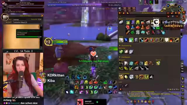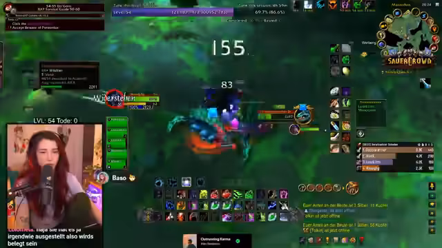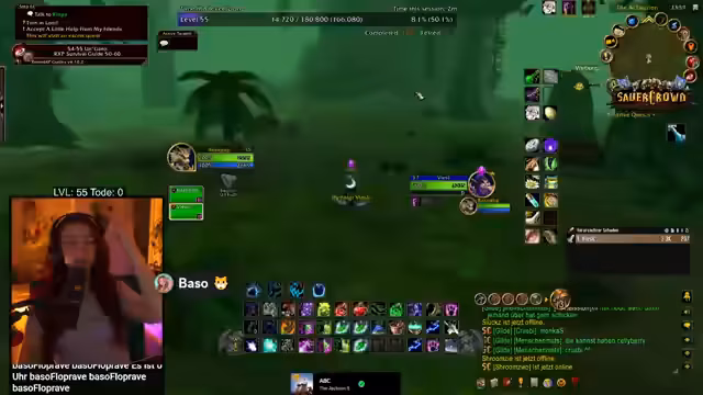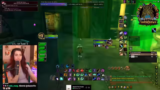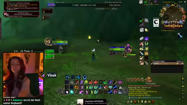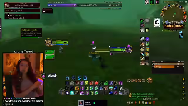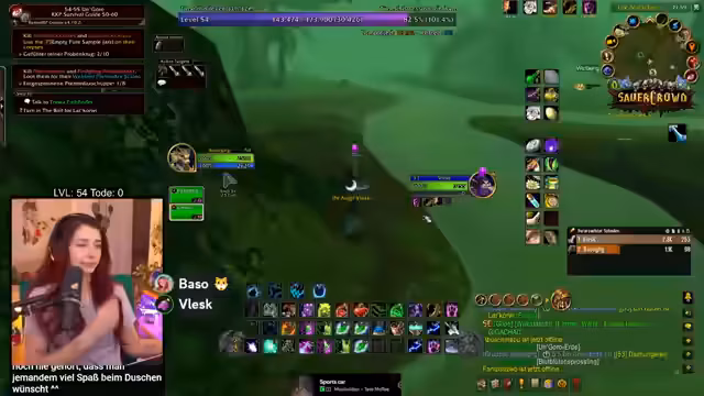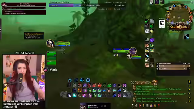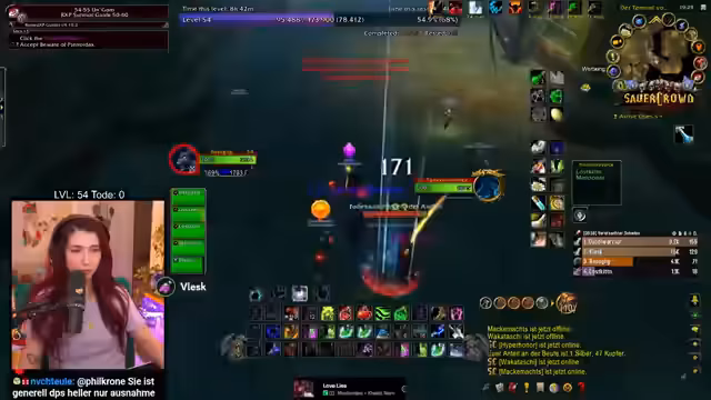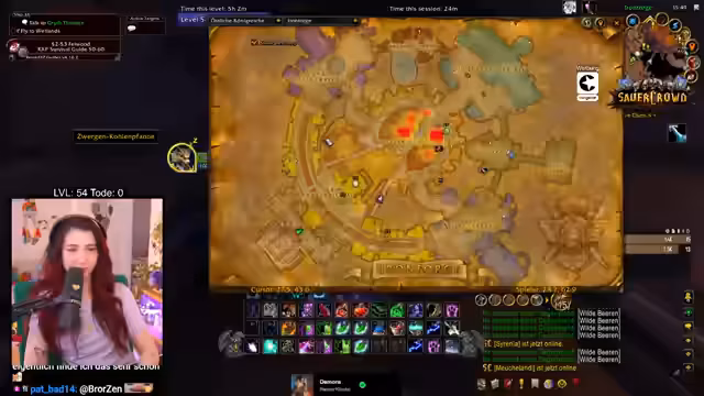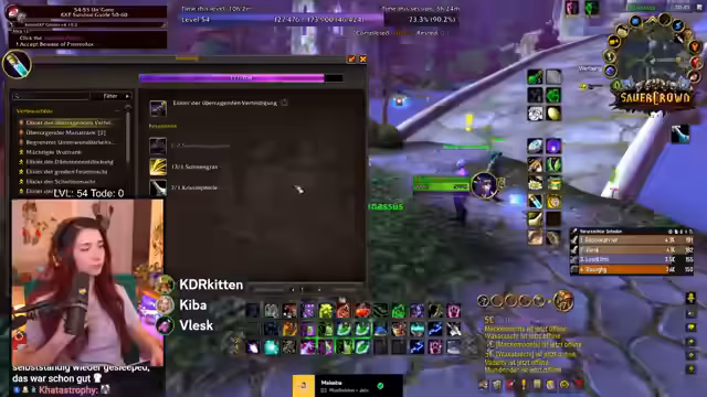 02:24:48Der Stream konzentriert sich auf das Leveln und den Grindingprozess in World of Warcraft. Der Streamer muss nach Abschluss des Levelgrinds wieder Kräuter für die Alchemie sammeln, um brauchbare Tränke herstellen zu können, die besonders für Buffs in Dungeons wichtig sind. Er erkundert auch die Einstellungen der Klassenfarben im Spiel, wobei er bei der Farbe für Gesundheit (HP) bleibt, da sein Gehirn grün stark mit Leben verbindt, anstatt der vom Krieger genutzten, für ihn unscheinbaren braunen Farbe.