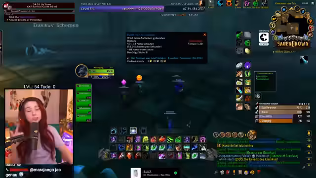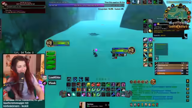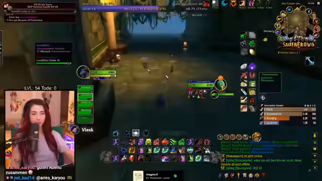 06:09:02Das Streamer-Inventar ist voll, was den Leveln-Grind behindert. Ein Huhn im Inventar wird freigelassen, um Platz zu schaffen, und Diskussionen über die Verteilung von Verteidigungs- und Mahntränken in der Gruppe laufen. Die Gruppendynamik ist angespannt, da der Streamer, als Level 54, den Fullrun durch einen Dungeon für die Gruppe als zu lange und unvorbereitet empfindet. Die Unsicherheit bezüglich des Dungeons und der Zeit lässt den Streamer vorschlagen, den Run abzubrechen und für einen späteren Termin zu planen.