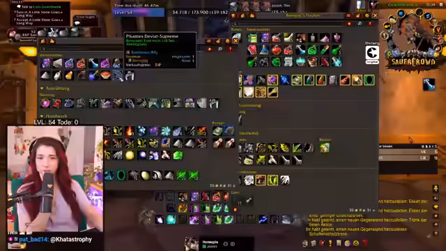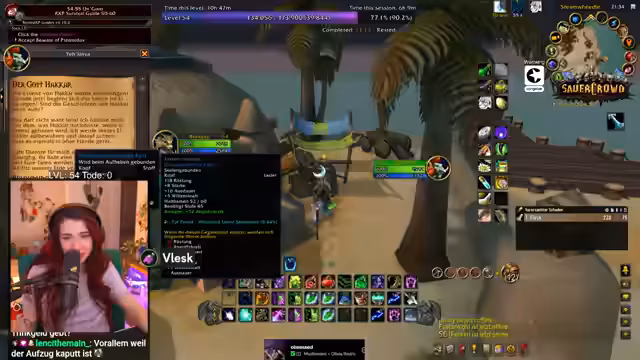 07:20:55Das bereits am Anfang des Streams beschlossene Inventar-Management wird nun problematisch, da die Taschen wieder überfüllt sind. Der Streamer reflektiert, dass dies trotz guter Absichten schnell wieder ein Problem darstellt. Trotzdem wird der Fokus auf das Questen gelegt, da mehr Zeit dafür zur Verfügung steht als geplant. Das Ziel ist, Level 55 zu erreichen und dabei Loot zu farmen.