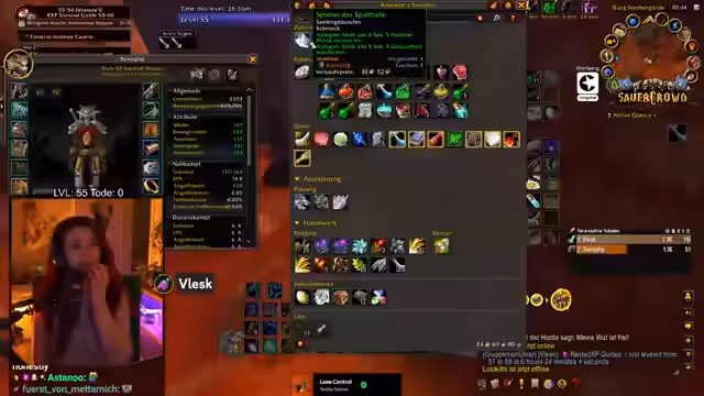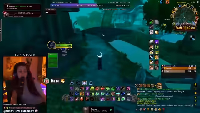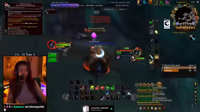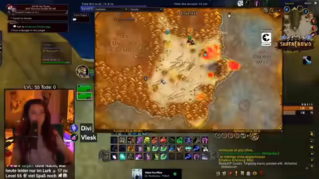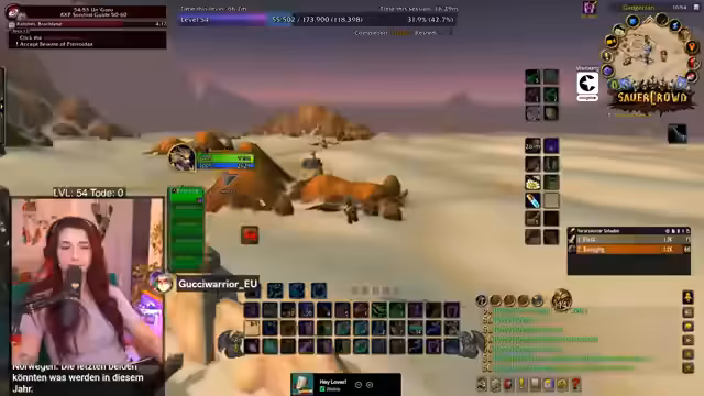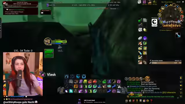 10:55:48Die bemerkenswerte Dauer des Streams wird thematisiert, der bereits 15 Stunden andauert und als 'Sauerkraut-WW-Projekt' bezeichnet wird. Der Streamer hat sich stark auf das Leveln konzentriert und den Questlog fast abgearbeitet. Er berichtet, dass er von 55,5 auf fast 58 gekommen ist. Die Tagesziele, wie das Erreichen von Post 43, werden genannt, und es wird geplant, wie der Mitspieler bei seinen Levelzielen unterstützt werden kann, indem ihm vorgefertigte Questitems zur Verfügung gestellt werden.