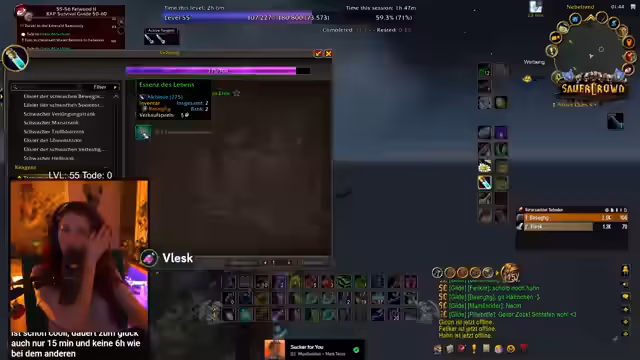 00:44:26Basel beginnt mit dem Gildenmitglied Vlesk zu grinden, um Level 60 zu erreichen. Sie stellen fest, dass sie unterschiedlich weit in den Quests sind, was die Koordination erschwert. Basel erhält Unterstützung von der Gilde, indem er neue Rezepte für Alchemie geschickt bekommt und sich dadurch als Alchemistin weiterentwickelt. Er muss jedoch sein Inventar und die Bank aufräumen, um Platz für Gegenstände zu schaffen, was den Prozess verlangsamt.