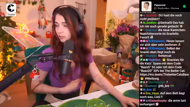 04:52:00Weil er gestern fast neun Stunden gestreamt hat und heute sehr spät ist, beschließt Baso heute früher auszusteichen. Er sichert jedoch zu, nächste Woche wieder zu streamen, um wieder in seinen Rhythmus zu kommen. Vor dem offiziellen Ende des Streams platzt noch eine spontane Werbung für den Sponsor The Better Cat, der gefriergetrocknete Katzensnacks anbietet. Baso probiert sie mit seinen Katzen Luna und Ferox aus und bewirbt einen Rabattcode für die Zuschauer.