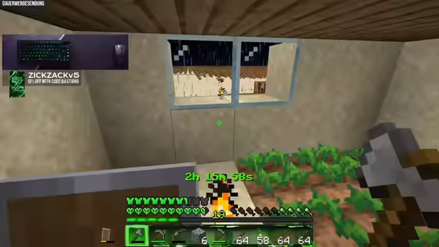 03:04:15Der Streamer reflektiert seine frühere Sucht nach Online-Anerkennung und Statistiken, merkt aber an, dass man dafür eine gesunde Distanz bewahren muss. Im Spiel wird die Basis weiter ausgebaut, indem Dead bushes gefarmt und Sticks für Leitern hergestellt werden. Gleichzeitig gibt es im Chat Diskussionen über den "Supporter"-Status und Spam-Verhalten einiger Zuschauer, die Timeouts provozieren.