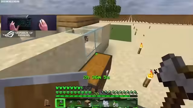 00:58:07Der Streamer zeigt die ersten sichtbaren Erfolge im Ressourcenmanagement. Er hat Sand gesammelt und in Sandstein umgewandelt, um damit bessere Werkzeuge und Materialien zu erhalten. Er plant den Bau einer Farm für Nahrungsmittel und hat bereits eine Mini-Plantage mit Karotten angelegt. Die Handelsmöglichkeiten mit den Villagern eröffnen weiteres Potenzial für den Aufbau der Basis und die Sammlung wertvoller Ressourcen.